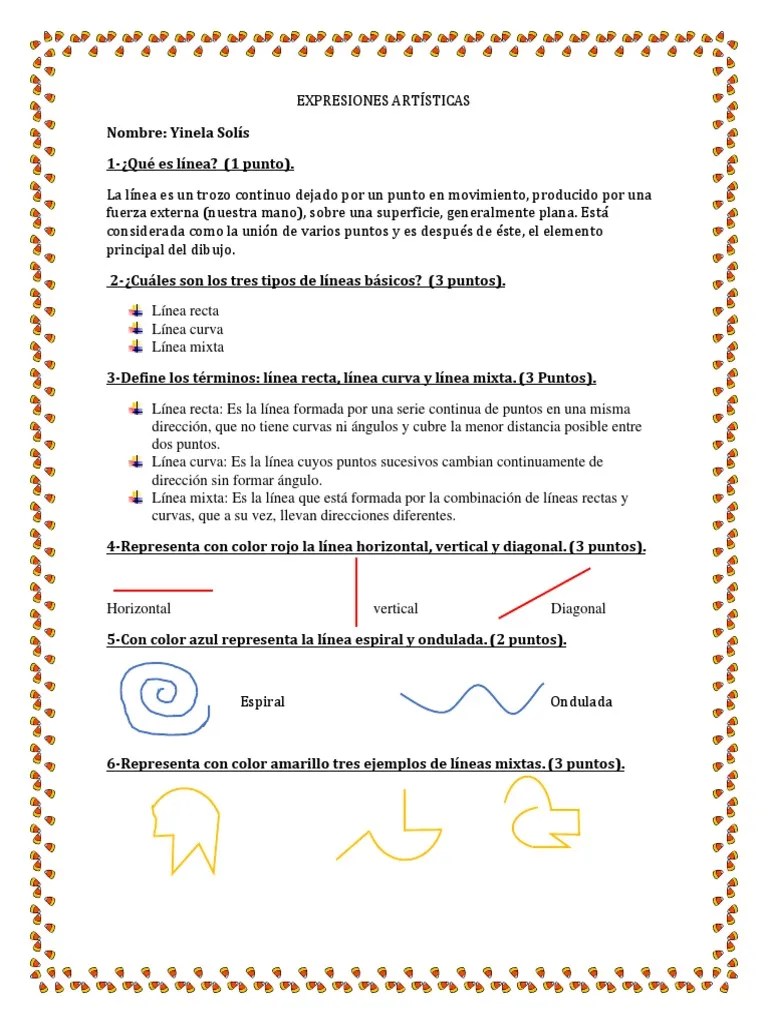 En correspondencia a las formas y de acuerdo a las impresiones que producen, cada tipo de línea posee un sentido psicológico especial, es decir, tiene su propia cualidad y de allí que son capaces de producir sensaciones de orden, desorden, calma, excitación, violencia, estabilidad, caída, movimiento, y otros.. Hay varios tipos de lineas: Está formada por la unión de varios puntos en sucesión; La línea como elemento expresivo. Define contornos, hace conexiones, separa o establece distancias. La línea en la obra de arte, según la finalidad del artista, cumple dos. Que es una linea es un punto en movimiento, un elemento básico en las artes plásticas, la linea es el primer paso en el proceso de creación artística. Con ella se delimita el contorno de las formas, base fundamental en el dibujo. En correspondencia a las formas y de acuerdo a las impresiones que producen, cada tipo de línea posee un sentido psicológico especial, es decir, tiene su propia cualidad y de allí que son capaces de producir sensaciones de orden, desorden, calma, excitación, violencia, estabilidad, caída, movimiento, y otros.