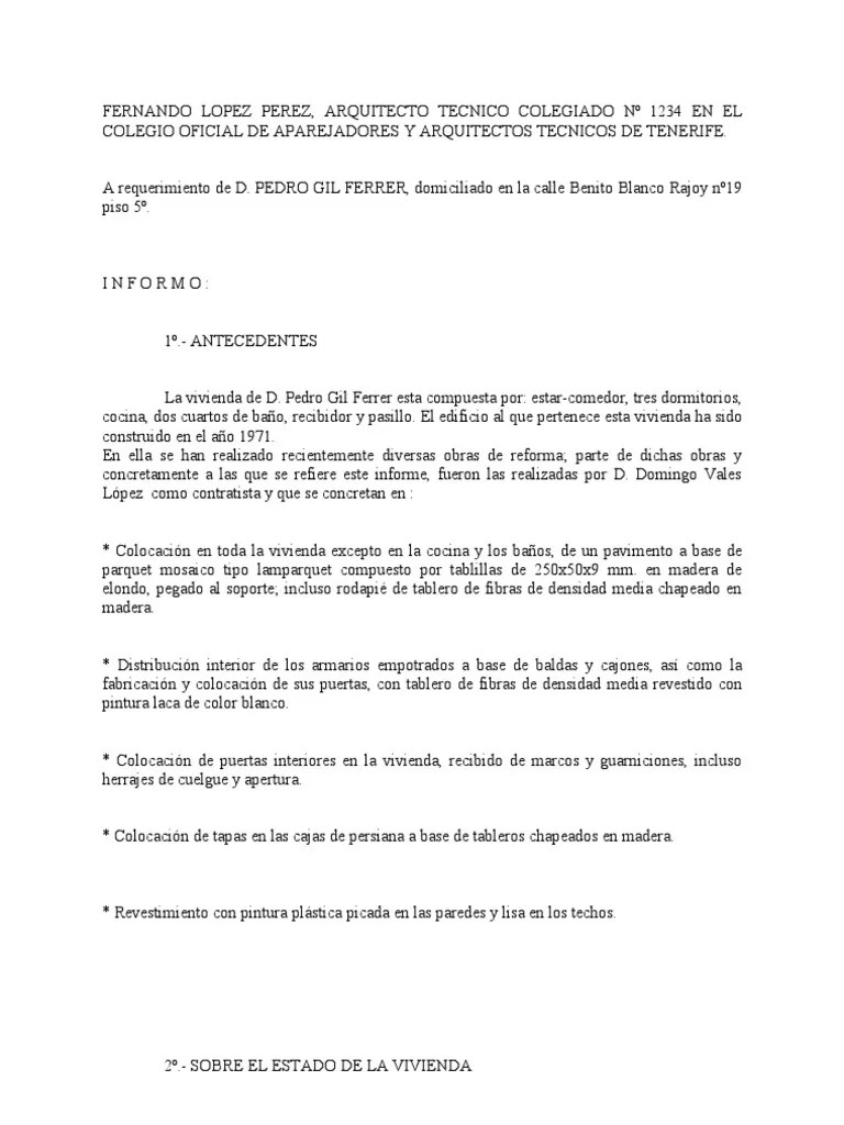 14.02.2019 · informe técnico de un arquitecto. Tipologia obra direccion comuna propietario arquitecto constructor: Un informe técnico es una exposición por escrito de las circunstancias observadas por el arquitecto en el reconocimiento de documentos, edificios, predios, etc., o tras el examen de una cuestión consultada, con explicaciones técnicas, económicas o de otra índole. Regularizacion ley 20.898 titulo i : Informe tecnico arquitecto regularizacion ley 20.898 titulo i sobre el cumplimiento de normas de habitabilidad, seguridad, estabilidad y de las instalaciones interiores. El informe técnico es descriptivo. Pongamos que habéis comprado un piso de obra nueva y detectáis goteras en los últimos pisos. 14.02.2019 · informe técnico de un arquitecto. Esto puede hacerse de una parte o de la totalidad de un edificio, vivienda o local, desde un punto de vista técnico. Esto significa que el arquitecto da su punto de vista objetivo sobre cuáles son los problemas que se detectan. Los informes o informes técnicos, son la exposición por escrito del reconocimiento de edificaciones, características de las mismas, documentos, etc. Esto significa que el arquitecto da su punto de vista objetivo sobre cuáles son los problemas que se detectan.