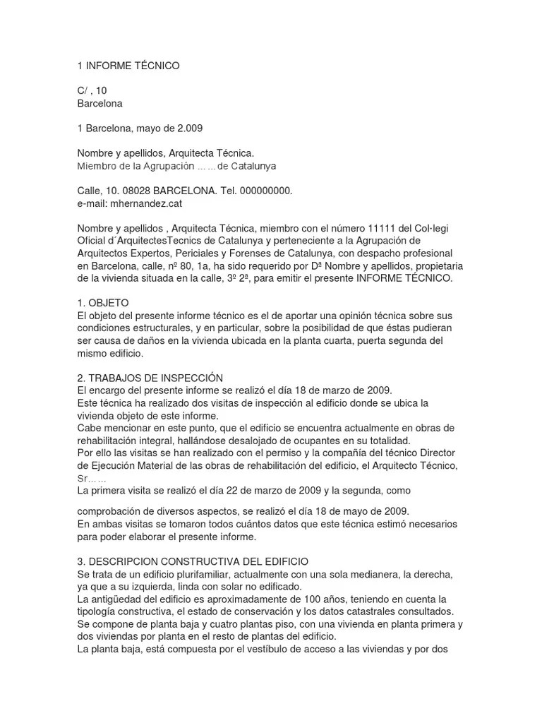 Pongamos que habéis comprado un piso de obra nueva y detectáis goteras en los últimos pisos... Realizados a partir del examen minucioso y detallado de un arquitecto superior, técnico o ingeniero. 14.02.2019 · informe técnico de un arquitecto. Informe técnico es la descripción, oral o escrita, realizada de una manera objetiva, que hace el arquitecto técnico sobre la naturaleza, características o circunstancias observadas en un suceso o asunto, en temas de su competencia profesional, en el reconocimiento parcial o general de predios, edificaciones, valoración de inmuebles, legislación urbanística o del examen de documentos.. Qué es un informe técnico un informe técnico es un análisis sobre un tema determinado con el fin de encontrar una solución o mejoría en algún aspecto del inmueble o estructura, o bien analizar un hecho técnico complejo.